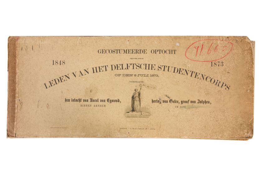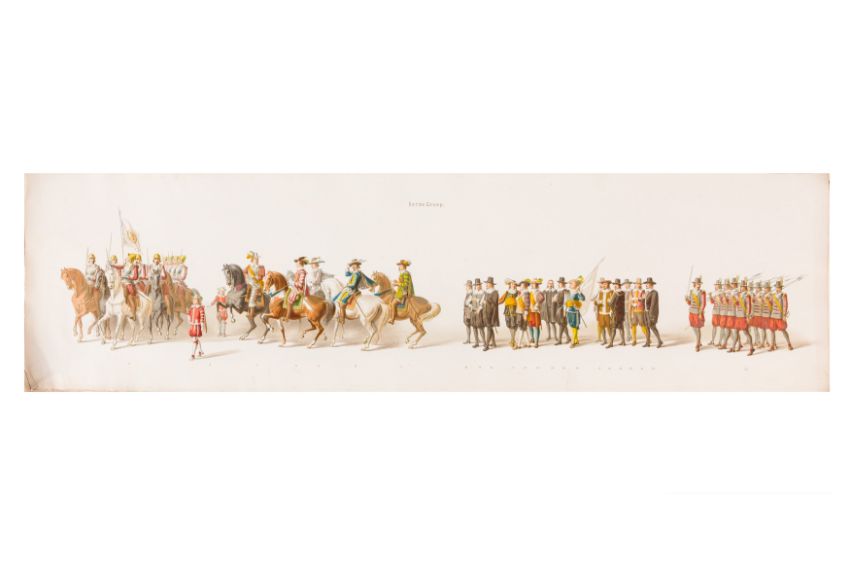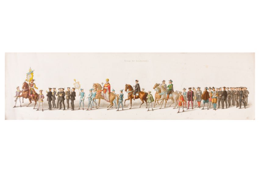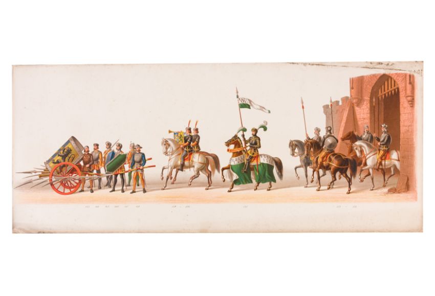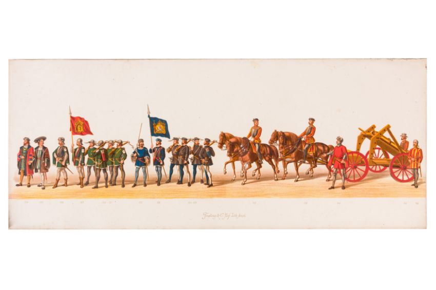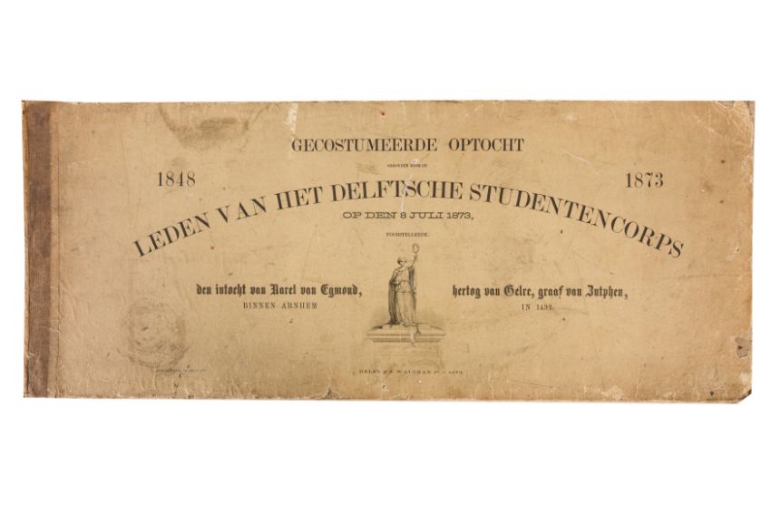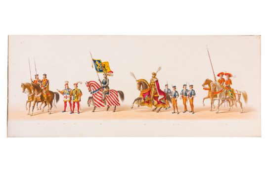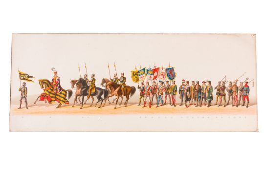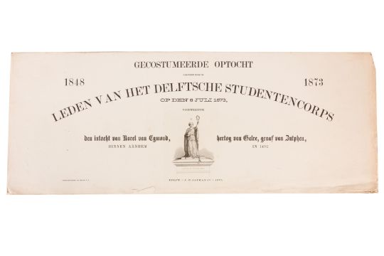 HISTORICAL COSTUME PROCESSION, DELFT, 1873. Dutch processional panorama comprising ten chromolithograph prints, title-sheet and 10 loose plates, each 290 x 730 mm, ref. numbers 1-155 in lower margins. The panorama commemorates the entrance of Karel of Egmond into Arnhem, 1492. Text on title-page duplicates that on front cover. [Gecostumeerde Optocht Gerhouden door de Leden van het Delftsche Studentencorps op den 8 Juli 1873. voorstellende den intocht von Karel van Egmond, hertog van Helre [?], graaf van Zutphen, binnen Arnhem in 1492. 1848 1873] [i.e. school founded 25 years earlier].