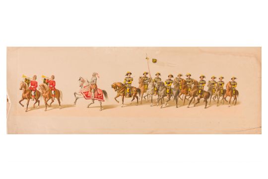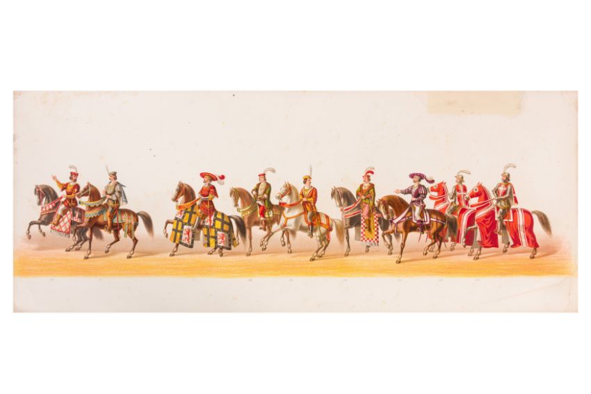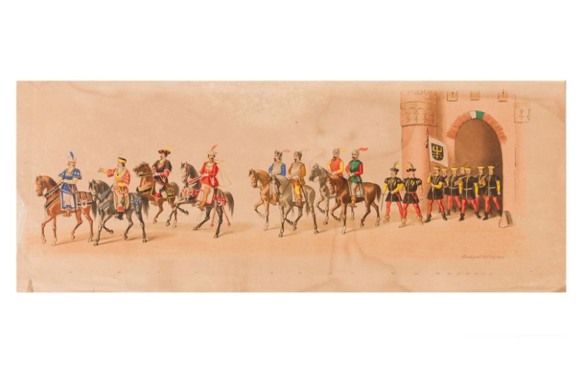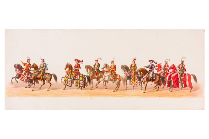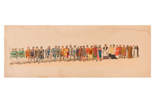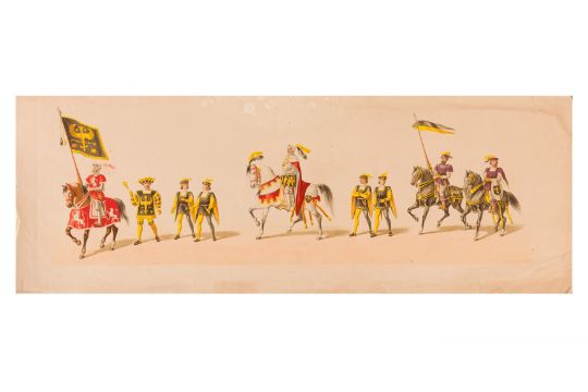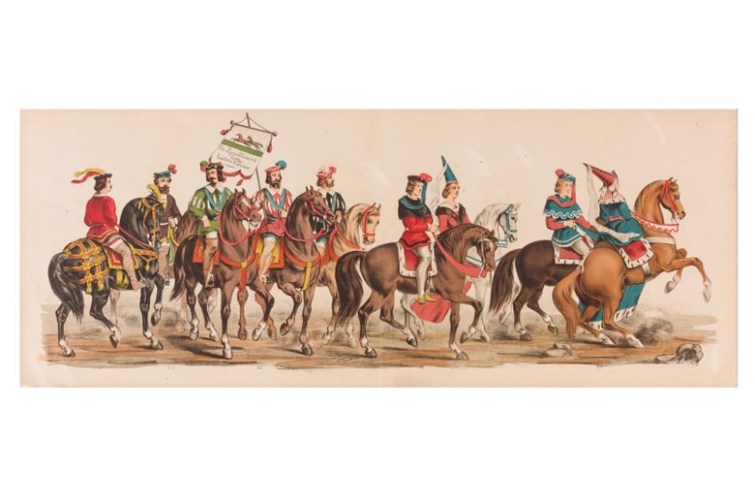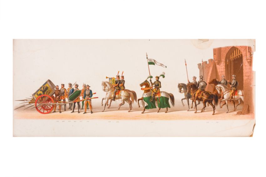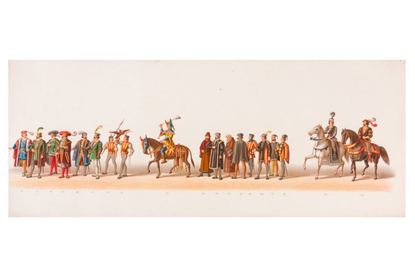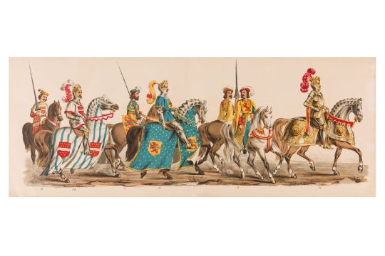 HISTORICAL COSTUME PROCESSION, DELFT, 1873. Dutch processional panorama comprising ten chromolithograph prints, title-sheet and 10 loose plates, each 290 x 730 mm, ref. numbers 1-155 in lower margins. The panorama commemorates the entrance of Karel of Egmond into Arnhem, 1492. Text on title-page duplicates that on front cover. [Gecostumeerde Optocht Gerhouden door de Leden van het Delftsche Studentencorps op den 8 Juli 1873. voorstellende den intocht von Karel van Egmond, hertog van Helre [?], graaf van Zutphen, binnen Arnhem in 1492. 1848 1873] [i.e. school founded 25 years earlier].