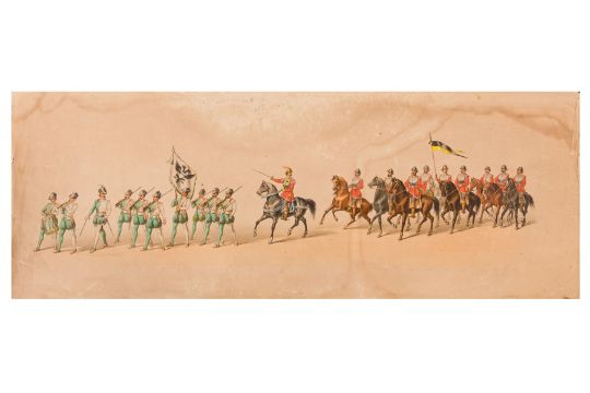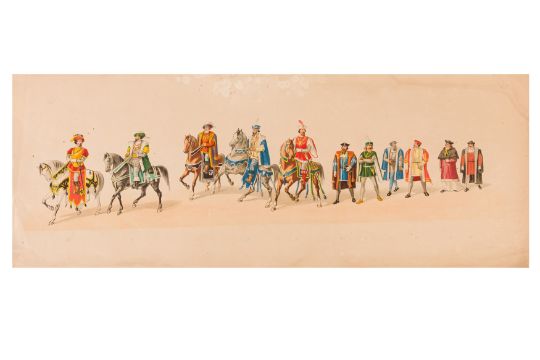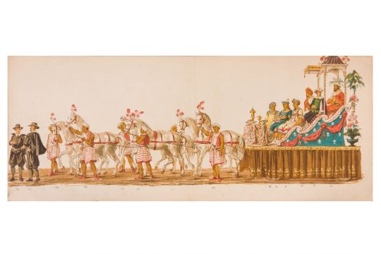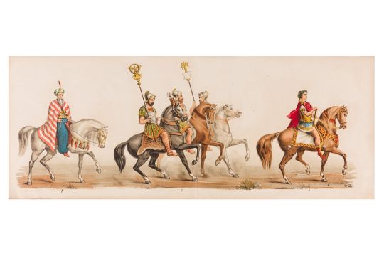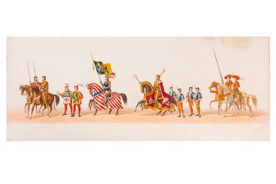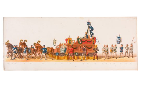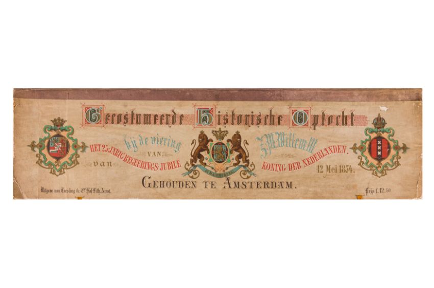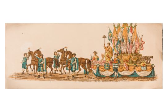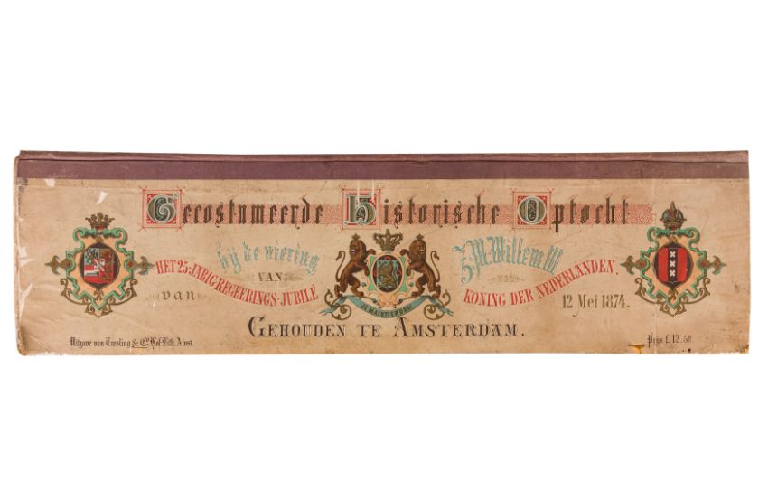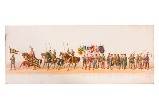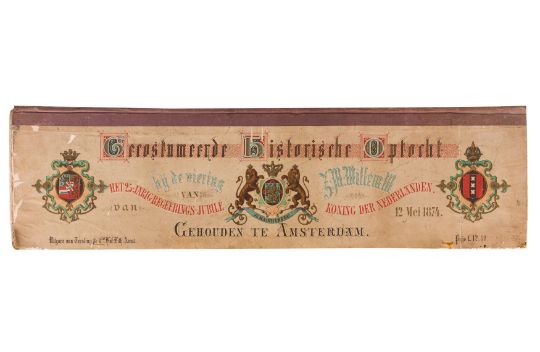 HISTORICAL COSTUME PROCESSION, AMSTERDAM, 12 MAY 1874. Dutch processional panorama, comprising two chromolitographic panorama albums,each consisting of nine (9) loose plates, each 230 x 840 mm, ref. numbers in the bottom margins, housed in portfolio measuring 255 x 870 mm. "Geconsumeerde Historische Optocht bij de viering het 25 Jarig Regeerings Jubile Z.M. Willem III Koning der Nederlanden 12 Mei 1874. Vitgave[?] van Tresling & Co. Hof[?]-Lith. Amst. ... van Gehouden te Amsterdam".