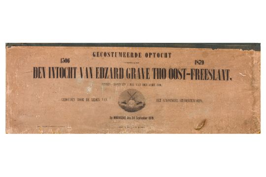 A group of six Dutch historical costume panoramas, comprising: HISTORICAL COSTUME PROCESSION IN GRONINGEN, 1879. Eight loose chromolithographic plates, each 303 x 830 mm, ref. numbers (1-129) in b. margins, housed in portfolio measuring 305 x 852 mm, Signed in print Tresling&Co. Hof. Lith. Amst. Titled "Gecostumeerde optocht voorstellende den intocht van Edzard grave tho Oost-Freeslant, binnen Groningen 1 mei van den jare 1506, gehouden door de leden van het Groninger studentencorps, op woensdag 24 september 1879".