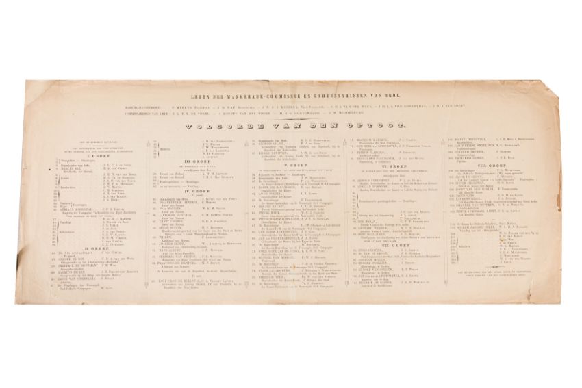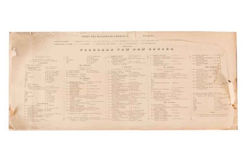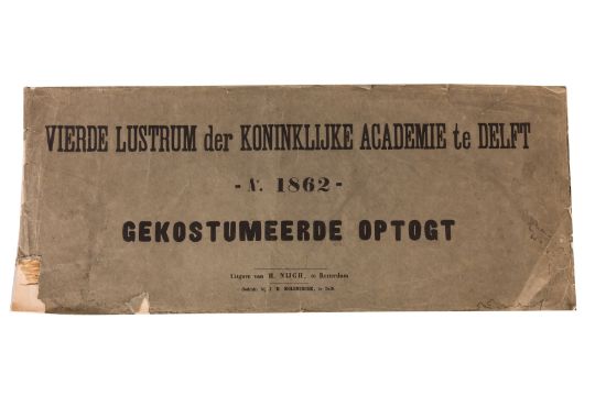 Two chromolitographic albums, 9 pages each, overall measuring 280 x 700 mm. Publication consisting of a key sheet and eight loose plates, each 270 x 670 mm, all housed in original wrappers, together with a smaller sheet of facsimile signatures. Fourth anniversary of the Royal Academy in Delft, 1862. Costume procession, published by H. Nijgh and printed by J.H. Molenbroek. [Vierde Lustrum der Koninklijke Academie te Delft, 1862. Gekostumeerde Optogt, Uitgave van H. Nijgh, te Rotterdam. Gedrukt bij J.H. Molenbroek, te Delft].