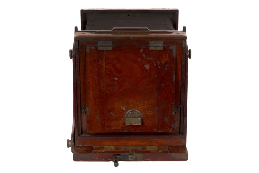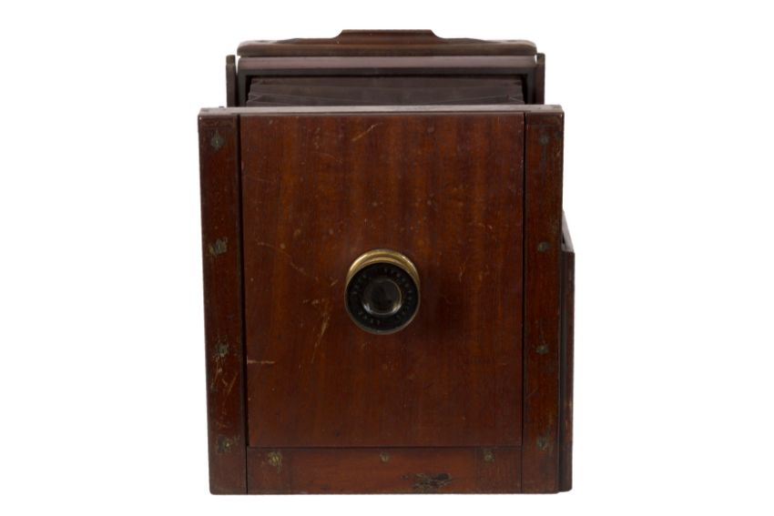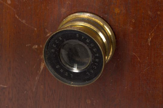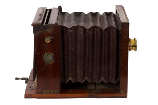 Body: Overall G, some weakness around rackwork focussing assembly - with later replacement lens board and red leather bellows London