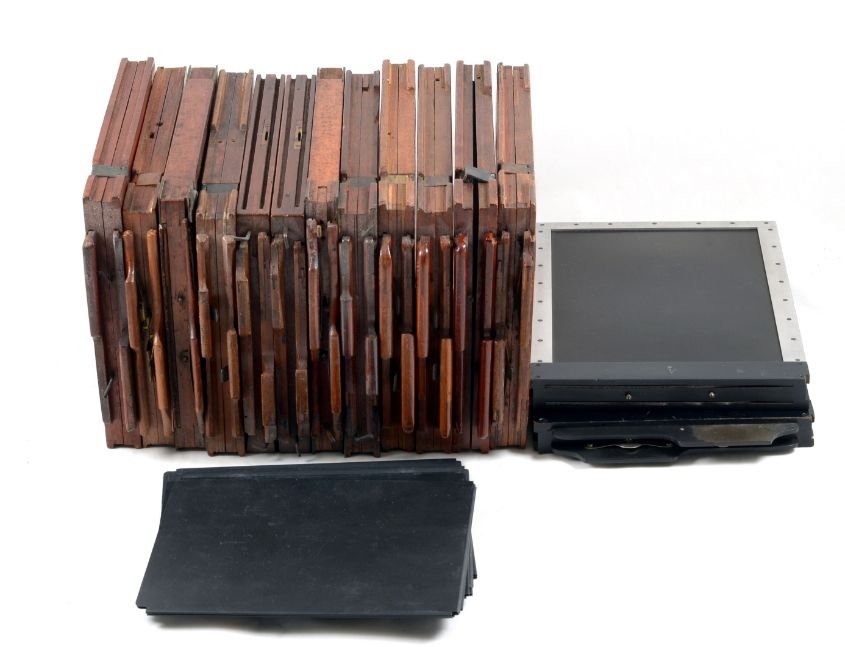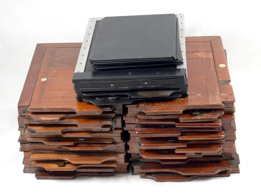 Fourteen Half Plate Film Holders. With a quantity of inserts for sheet film. Several different designs, all with signs of normal use.