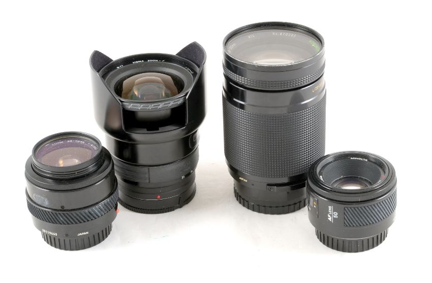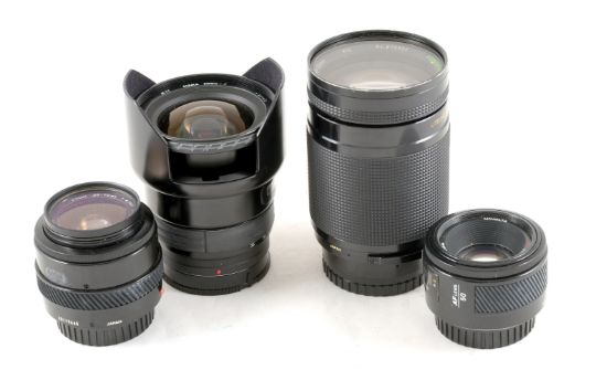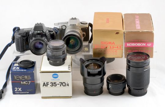 An Extensive Minolta AF Film Camera Outfit. Comprising a working Minolta Maxxum 5 with 28-80mm 3.5-5.6 D zoom and a working Minolta Dynax 2xi (working, but battery cover broken off at the front) with a Minolta 50mm f1.7 AF lens. Also an uncommon Sigma 21-35mm f3.5-4.2 AF zoom, a Koboron 28-20mm AF zoom, both Minolta AF fittings and a Minolta AF 35-70mm f7 macro zoom and a x2 AF tele converter. Also a Minolta 50mm f1.7 AF lens (blades not returning).