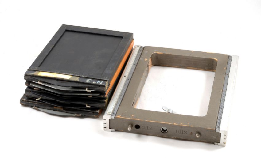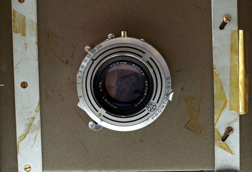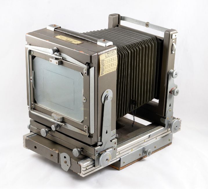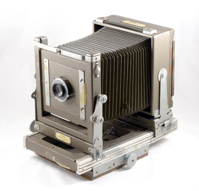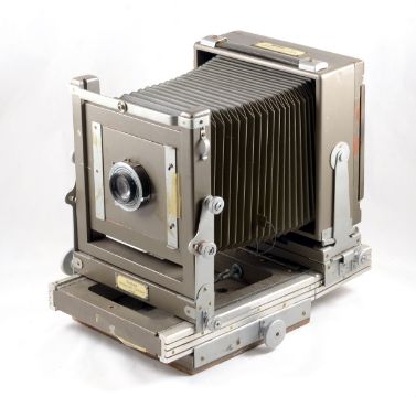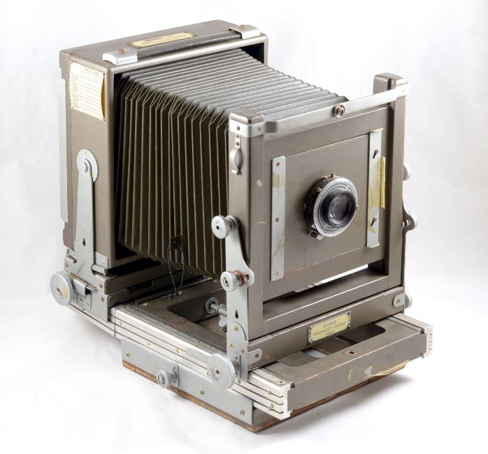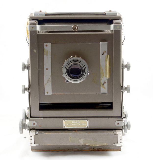 Kodak Specialist Model 2 Half Plate Studio Camera. With Ektar 203mm f7.7 lens in a Prontor SVS (working) shutter. Some loss of veneer to underside of rail bed and bellows very dry, otherwise signs of normal+ use. Comes with extension rail and four DDS.