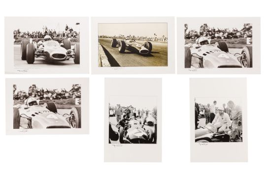 SILVERSTONE, 1950s-1960s. A mix of silver and pigment prints (7), images sizes approx. 260 x 375mm (or the reverse), each signed, titled, and dated by the photographer in ink with signature blindstamp lower margin recto, with additional titles and details by the photographer in pencil verso, and copyright credit stamps verso. Subjects include: Jack Bramham Winning International Tropy Race, Silverstone, 1966 (2); Stirling Moss, Silverstone, 1958 (2 prints, each editioned 2/50); John Surtees, Ferrari, 18th International Trophy Meeting, Silverstone, 1966 (2); and a toned print of Jim Clark at Silverstone c.1965.