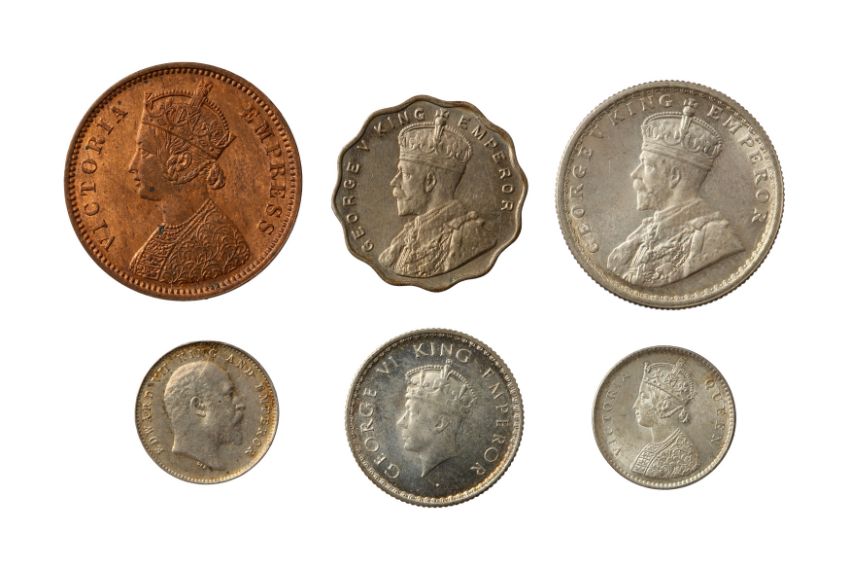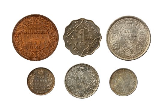 consisting of: 1880 C 1/4 anna, KM. 486, must lustre extant, Brilliant Uncirculated. 1914 B anna, KM. 513, Brilliant Uncirculated. 1862 2 annas, KM. 469, Uncirculated. 1905 2 annas, KM. 505, Almost Uncirculated. 1940 B 1/4 rupee, KM. 545, Uncirculated. 1936 C 1/2 rupee, Uncirculated.