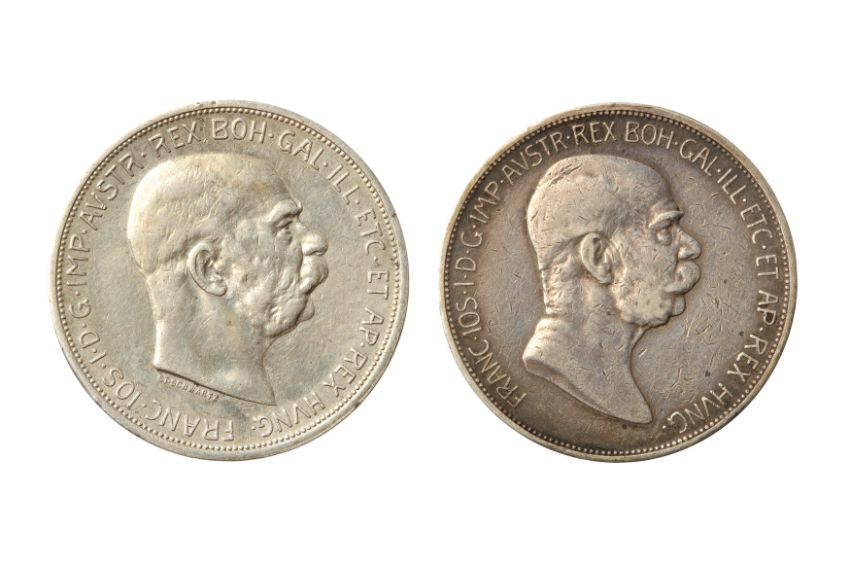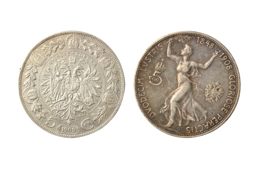 consisting of: 1908 5 corona, Obv: Bare head of Franz Joseph I facing right. Rev: Fame running left with olive branch in right hand. KM. 2809. Good Very Fine. 1909 5 corona. Obv: Older, bare head of Franz Joseph I facing right. Rev: Imperial double headed eagle, 1909 below. KM. 2813. Good Very Fine - Near Extremely Fine.