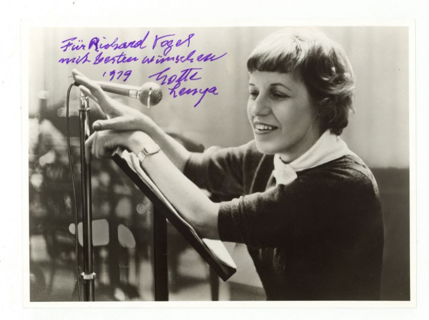 Scarce black and white photograph of Lenya standing at a microphone, signed and inscribed in German "Fur Richard Vogel, mit besten wunschen, 1979, Lotte Lenya", typed caption to the verso, 7 x 5".