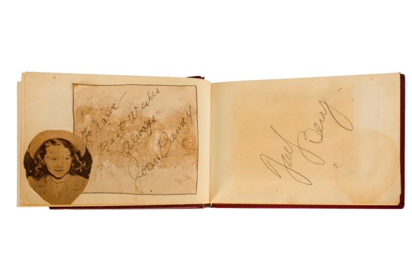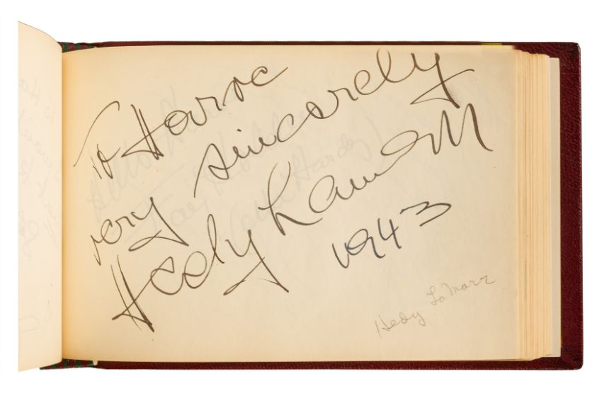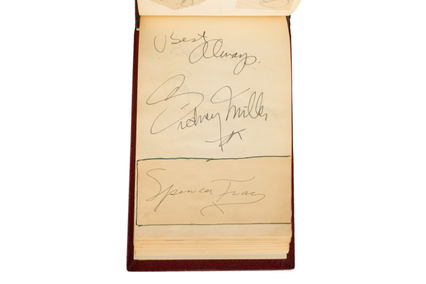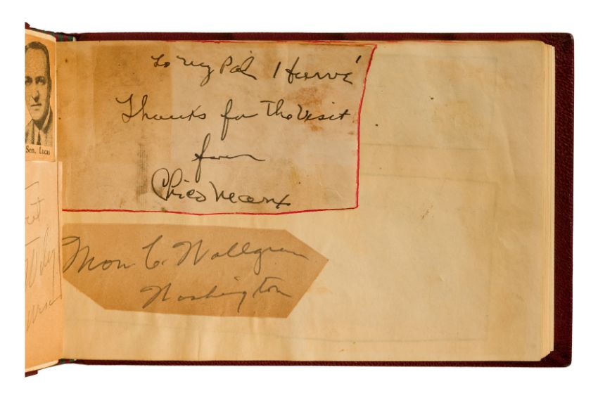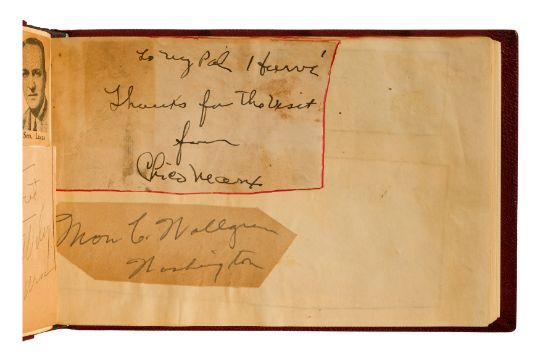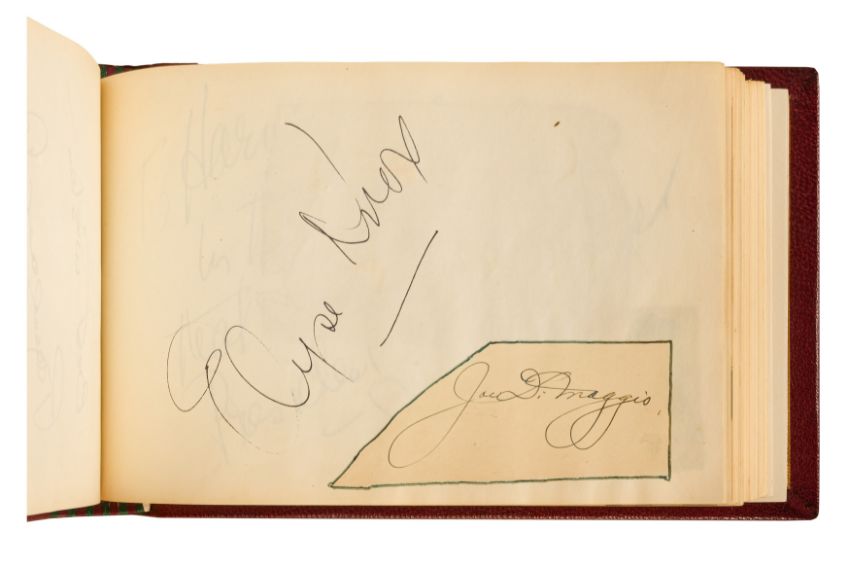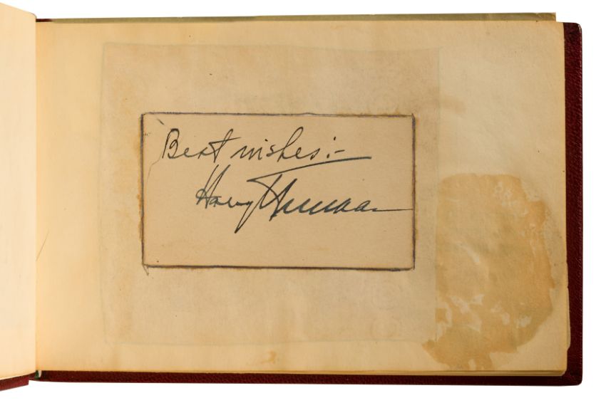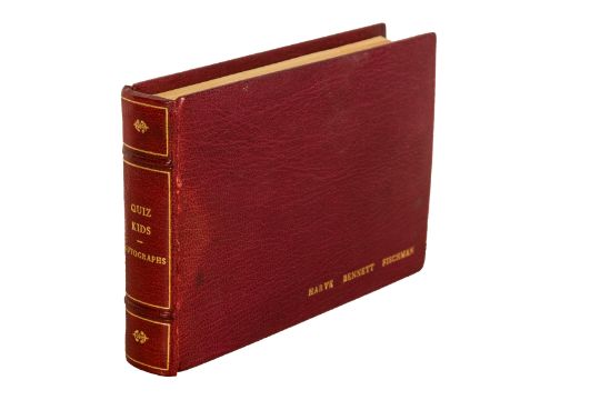Album featuring autographs by many prominent figures, obtained by Bennett while on the programme Quiz Quids, highlights including: Henry Truman, Mamie Eisenhower, Henry A. Wallace, Donald O'Connor, John Vandercook, Sabu, Joe E. Brown, Lillian Gish, Veronica Lake, Lin Yutang, Chico Marx, Cecil B. DeMille, Eve Curie, Tallulah Bankhead, Mickey Rooney, Eddie Cantor, Red Skelton, Hedda Hopper, Hoagy Carmichael, Lana Turner, Herb Graffis, Irene Dunne, Georgie Price, Leland Stowe, Edward Everett Horton, Oscar Levant, John Kieran, Clifton Fadiman, Bing Crosby, Hedy Lamarr, Edward G. Robinson, Gene Kelly, Lucille Ball, Joe Di Maggio, Susan Hayward, Harold E. Stassen, Lon Chaney, Walter Lantz and others, miscellaneous collection comprising clipped signatures, letters and cards pasted onto album pages and usually accompanied by clipped magazine photos of the signers, some discolouration and staining due to glue, dark red morocco with gilt lettering, in custom-made slip-case, oblong 8vo.