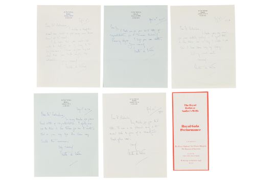 Five autograph letters signed ('Ninette de Valois') to Mr Richardson, mostly thanking him for his previous letters conveying birthday wishes and congratulations, one reading "I enclose a leaflet about our gala as you may not have heard of the event. I do hope you will be able to support us by coming to the performance. Please inform anyone else that you think might be interested", with leaflet for a Royal Gala Performance at Sadler's Wells included; five pages in total, 4to, 14 the Terrace, Barnes, 1 August 1974 - 21 April 1980 (6)