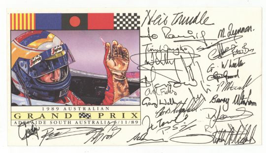 A First Day Cover signed by Ayrton Senna, Alain Prost, Ron Dennis, Jo Ramirez, Steve Nichols, Gary Wheeler, Gordon Murray, Neil Oatley, Neil Trundle, Tim Wright and numerous other team members, 19 x 10.5cm.