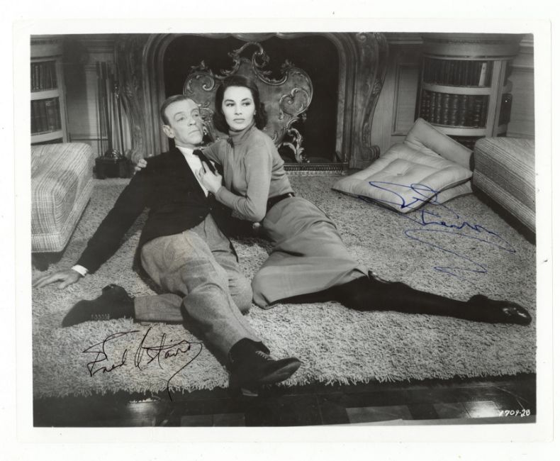 Black and white photograph of Astaire and Charisse in a scene from the movie 'Silk Stockings' (1957), signed by both actors in different inks, light handling wear to margins, 10 x 8".