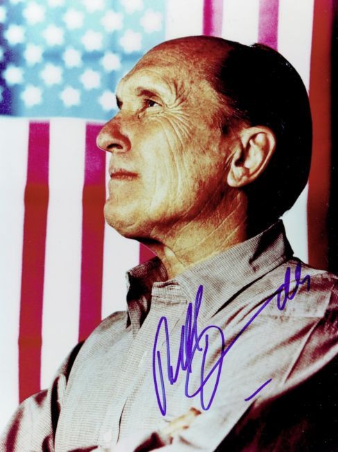 Colour photograph of Duvall standing in front of US Flag, clearly signed in blue felt tip, 10 x 8".
