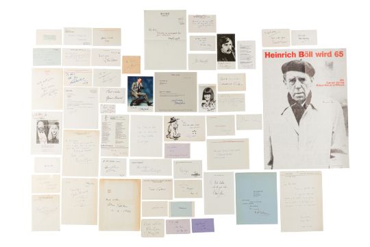 Selection of letters, photographs and cards signed by prominent authors and playwrights, comprising: Dodie Smith, Enid Blyton (clipped signature), Leon Garfield (handwritten note to the vendor, Michael Bond (signed Paddington card), Roald Dahl (signed card), Dick Francis, James Herriot, Francis Durbridge, Hammond Innes, Jeffrey Archer (signed photograph and accompanying typed letter), John Le Carre', Leslie Charteris, Edna O'Brien, Leslie Thomas, Richard Gordon (handwritten thank-you note), Michael Moorcock, Charles Causley, Pam Ayres (signed photograph and complimentary slip), John Betjeman, Jon Silkin, Doris Lessing, Harold Pinter, William Golding, John Osborne, Heinrich Boll (signed promotional pamphlet), Angus Wilson, John Fawles, Daphne du Maurier, Iris Murdoch (signed thank you card), Laurie Lee, Isaac Asimov, Arnold Wesker, Alan Sillitoe, John Wain, Stan Barstow, Kingsley Amis, John Braine, Simon Gray, Alan Bennett (clipped signature), Ben Travers (signed thank you card), Edward Bond, Edward Albee (signed photograph), J.B. Priestley, Tom Stoppard, Alan Ayckbourn, Alan Plater (signed letter), Bill Naughton, David Mercer (signed card addressed to the vendor), Trevor Griffiths, Michael Hastings, Alun Owen and Athol Fugard, v.s. (55)