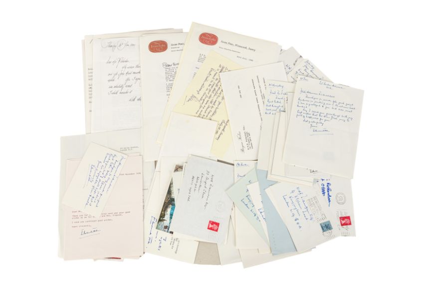 A very large collection of letters and cards from many prominent British actors, addressed to Mr Richardson, comprising: Jack Allen, Arthur Askey, Peter Wynn Barkworth (three thank you letters, one also saying "One of the nice things about winning an Award is that it seems to give so many people so much pleasure", 21 March 1978), Sam Beazley, Steven Beroff, Michael Blakemore, Jeremy Brett (thank-you postcard), Richard Briers (a black and white signed photograph, fifteen Christmas cards and nine thank-you notes), Simon Callow, Ian Carmichael, Tom Conti (nine letters, mostly thanking the recipients, one saying "I am glad that you enjoyed 'The Norman Conquests'; it was fun, a bit tricky to make", 26 January 1978), Brian Cox (typed letter saying "Awards are always tough things to accept but curiously it makes it much more worthwhile because of the letters of congratulations one receives! It's very humbling to know one's work is appreciated", 29 January 2003), Michael Crawford (signed souvenir programme for 'Billy' at the Theatre Royal Drury Lane), Jim Dale, Anthony Daniels (signed black and white photograph), Nigel Davenport (typed letter on Act For Equity headed paper, regarding the creation of a group within Equity to fight against political interference within the union, n.d. but 1975), Roy Dotrice, Bryan Forbes (fourteen letters and two Christmas cards signed by his wife Nanette), Edward Fox (ten letters, mostly discussing his engagements, one thanking Mr Richardson “for your good wishes to me for Edward and Mrs. Simpson", 15 November 1978; five New Year's cards), James Fox, Robert Fox (thank-you card), Marius Goring (several signed typed papers related to the Equity Council), Clinton Greyn, Robertson Hare (typed letter thanking Mr Richardson "for your sympathetic thoughts in my recent bereavement", 22 November 1969), Roy Hudd, Jack Hulbert (four typed letters thanking Mr Richardson for his good wishes), Richard Johnson, Peter Jones (two typed letters mentioning the Coronet Theatre, one saying "I would certainly support any effort to preserve it. Could we put on a show to help raise the money to buy it?", 1 March 1973), Stacy Keach, Michael Kitchen (five autograph letters, one saying "I'm glad you enjoyed 'Caught on a Train' and pleased you're still watching", 29 December 1980), David Kossoff, Leigh Lawson, Malcolm McDowell, Bryan Marshall (typed letter saying "I did, indeed greatly enjoy playing my role of Commander Glenn, and agree with you that the series maintained a good standard throughout"), Daniel Massey , Raymond Massey (twelve autograph letters, mostly thanking Mr Richardson for his birthday greetings), Michael Medwin, Alan Melville (ten typed letters, discussing Melville's upcoming roles), Robert Morley (six typed thank-you letters), Richard Pasco, Martin Potter (two autograph letters about future projects), Robert Powell (three typed thank-you letters), Corin Redgrave (typed letter saying "It was very kind of you to write about my performance in 'Oh! What a lovely War!'. I have a great affection for the film", 15 December 1970), Ian Richardson (nine typed letters, discussing various tv series and movies he was working on at the time, one letter saying "I am idle at the moment, having just finished two Sherlock Holmes films for American television, and am waiting to find out if they want to make it into a series"), Andrew Sachs, Leonard Sachs, Paul Scofield (three autograph letters, one thanking Mr Richardson for his "appreciation of my being included in the New Year's Honours list", 7 January 2001), Alastair Sim (typed note thanking Mr Richardson for his "note of appreciation re 'The Prodigal Daughter'. I enjoyed playing it very much", 14 January 1975), Brian Stirner, Clive Swift, Jimmy Tarbuck (typed letter saying "It was very kind of you to write concerning Sir Harry Secombe and 'Songs of Praise'. You are absolutely correct; it is sad to see him without his energy and people do forget [...] what a great comedian he really was", 6 November 2000), John Thaw (two thank-you letters), Frankie Vaughan (typed thank-you note), Emlyn Williams (ten thank-you letters and cards), Simon Williams (typed letter thanking Mr Richardson for his condolences on the death of Williams's sister) and Peter Wyngarde, v.s (quantity)
