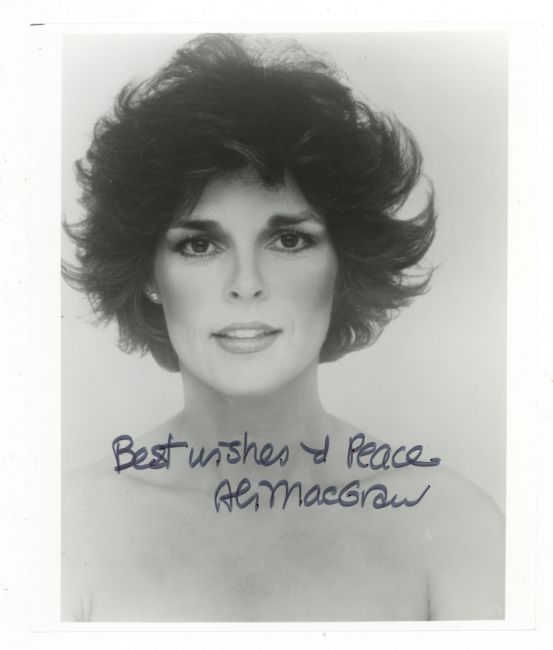 Glossy black and white photograph of MacGraw in a head and shoulders pose, signed across the lower portion of the image "Best wishes & Peace, Ali MacGraw", 10 x 8".