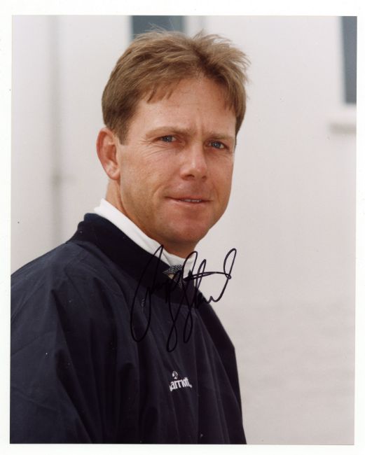 Colour photograph of the American golfer in a head and shoulders pose, signed by Stewart in black ink across the image, 10 x 8".