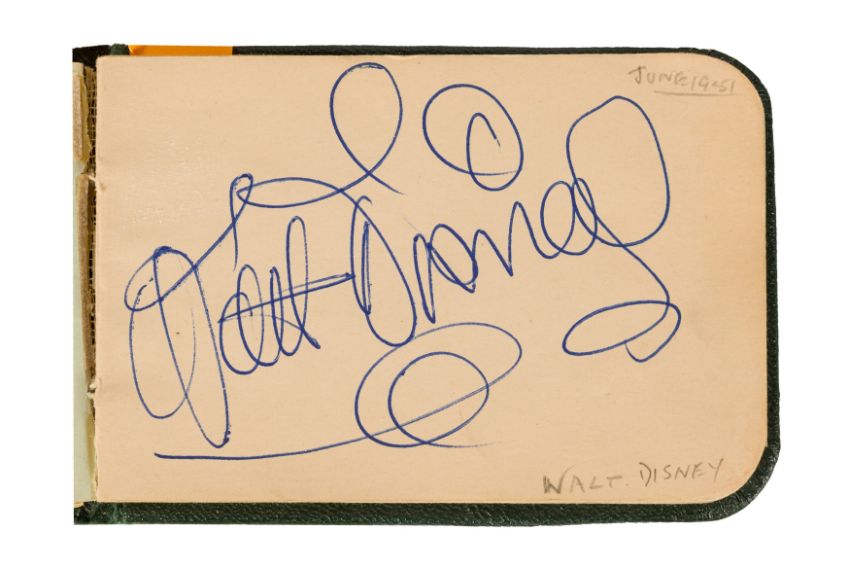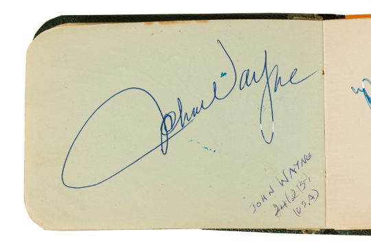 Autograph album featuring signatures by various entertainers and actors, including: Bransby Williams (two autographs, one with a self-portrait of him as Mr Micawber, Nat Allen, John Wayne, Jimmy Edwards, Geoffrey Sumner, Raymond Maye, Robert Donat, Maj Britt, Anton Karas, Carole Carr, Jack Payne,Wilfred Pickles, Reginald Denney, Victor Silvester, Jack Buchanan, Nancy Price, Terry Thomas, Kathleen Ferrier, Avis Scott, Richard Hearne, Donald Peers, Wallis Gold, Geraldine Fitzgerald, Stanley Holloway, Greta Gynt, Odette Churchill, Margaret Rutherford, Leslie Mitchell, Arthur Askey, Jerry Desmond, Ralph Lynn, Richard Todd, Walt Disney, Malcolm Sargent, Tex Ritter, Lev Pouishnoff, Cyril Smith, Barbara Windsor and others, some signatures clipped and pasted onto album pages, a few loosely inserted, handling wear, green faux-leather, joints a bit tender and with occasional tape repairs, small 8vo, c. 1950s; also including photographs signed by Peter Haigh, Noelle Middleton, Mary Malcolm, Sylvia Peters and others, mostly 5.5 x 3.5" (13)
