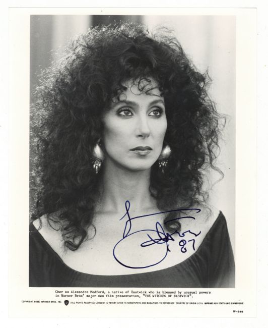 Glossy black and white promotional photograph of Cher as Alexandra Medford in 'The Witches of Eastwick' (1987), clearly signed on a light portion of the image, in very good condition, 10 x 8".