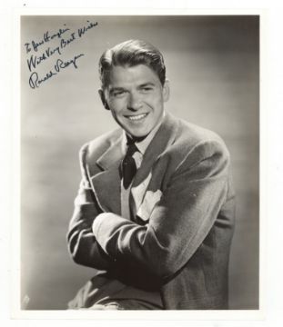 Vintage black and white studio photograph of a young Reagan, signed and inscribed "To Jess Hooglin, With very best wishes, Ronald Reagan" near the upper left corner, stamps on the verso, in very good condition, 10 x 8".