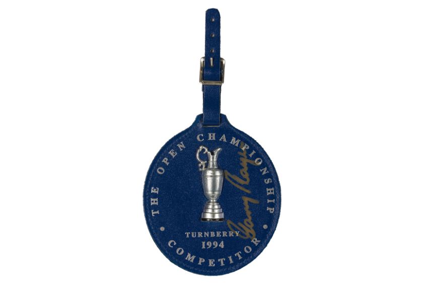Personal golf bag tag used at the 1994 British Open Golf Championships at Turnberry, signed by Gary Player.