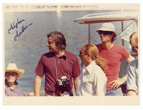 Colour candid landscape photograph of Sondheim on a boat with others, signed by Sondheim in fountain pen ink, in very good condition, 10 x 8".