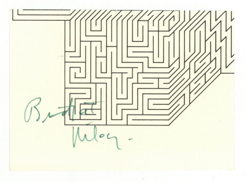Green ink signature on off-white card, trimmed along margins, 10.5 x 14.3cm