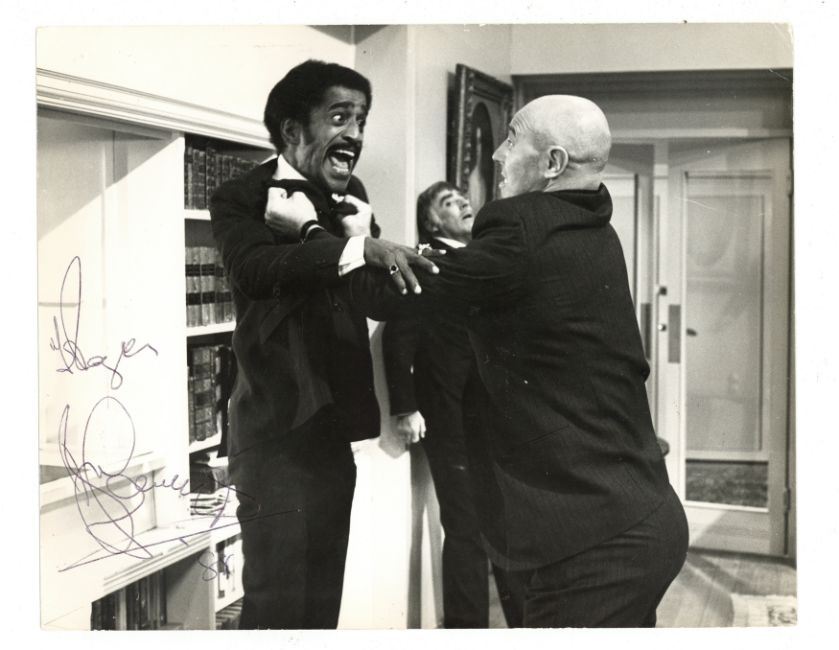 Vintage black and white photograph from the movie 'One More Time' featuring Sammy Davis Jr and Bill Maynard, signed and inscribed in black ballpoint ink "To Roger, S.Davis Jr '88", some creasing to corners, typed caption to the reverse, 10 x 8".