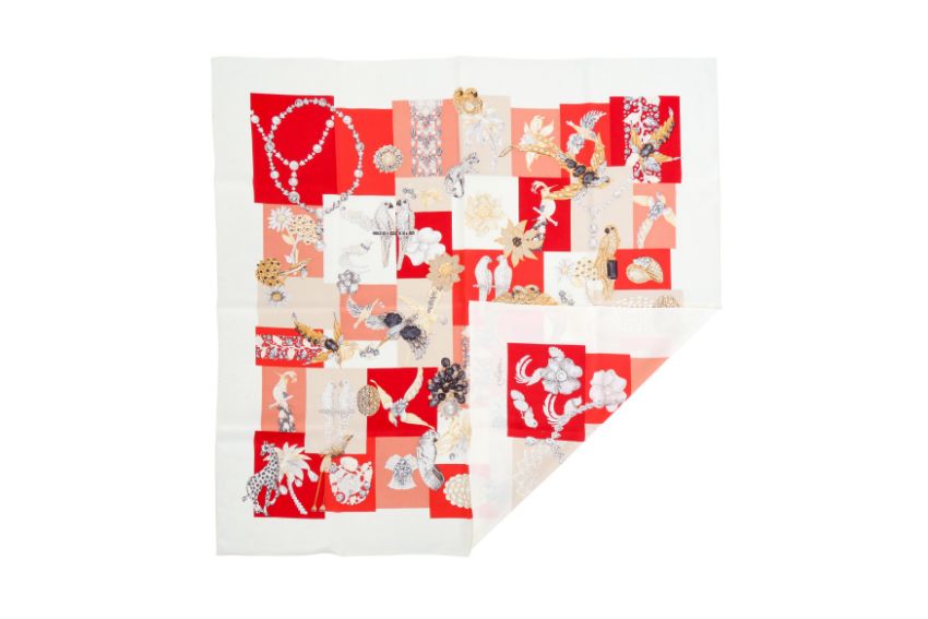 Cartier Jewelled Precious Fauna and Floral Silk Scarf, red and pink, cream ground