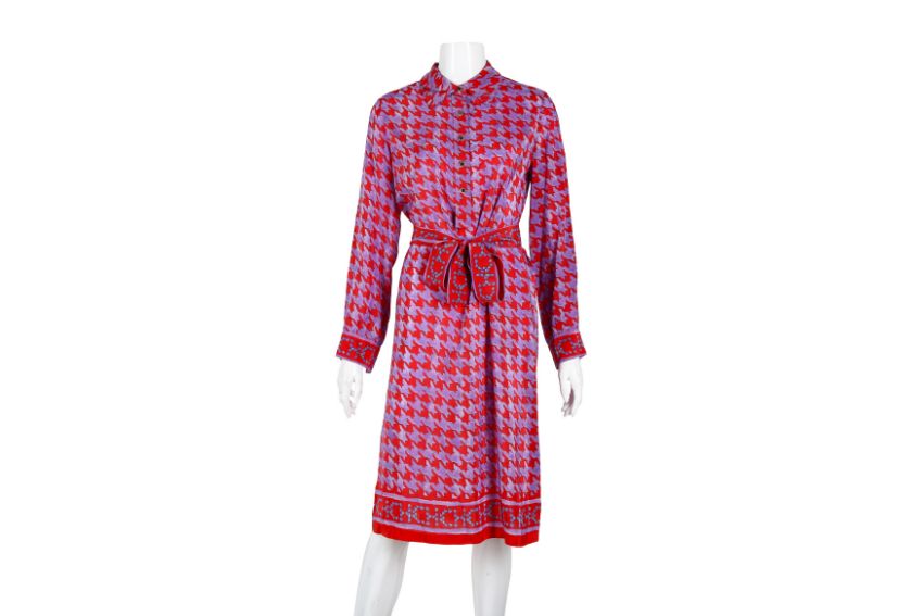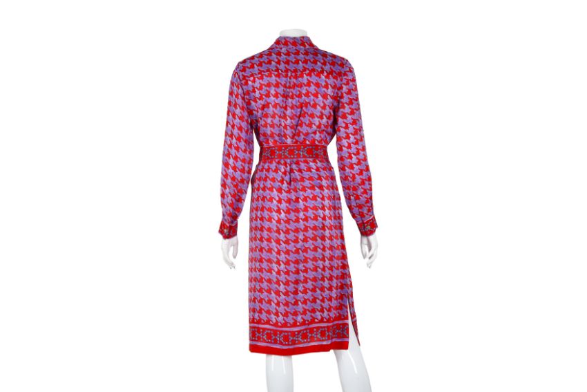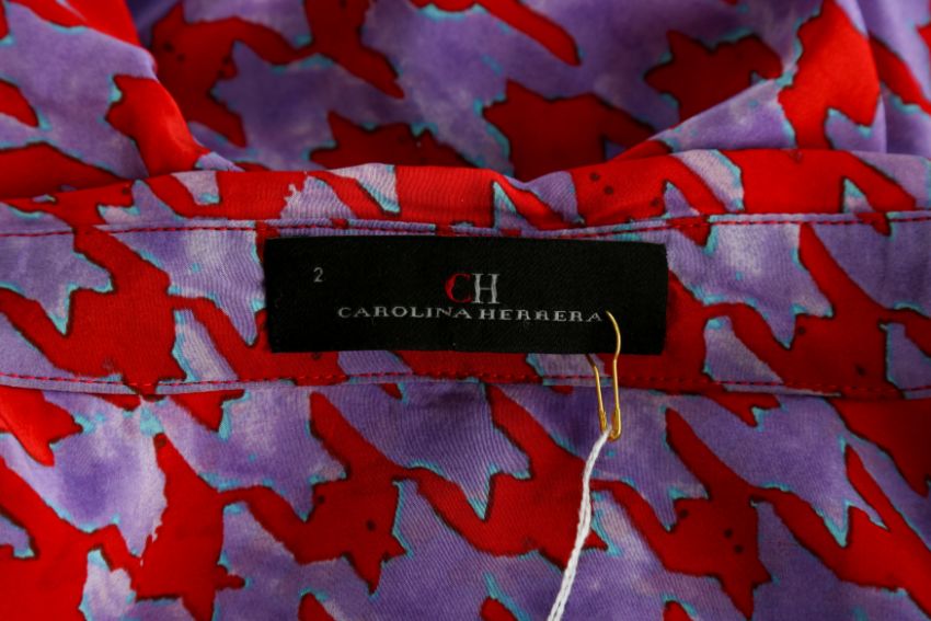 CH Carolina Herrera Purple Print Shirt Dress, red geometric design, gold tone hardware, labelled size US 2 (UK 6), 1980's
