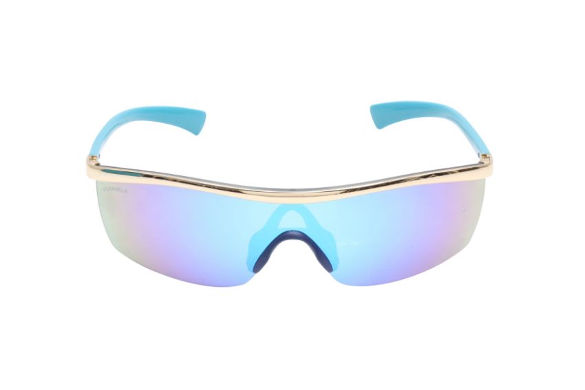 Chanel x Pharrell Blue Mirror Sheild Sunglasses, blue acetate arms, mirrored lenses, gold plated hardware