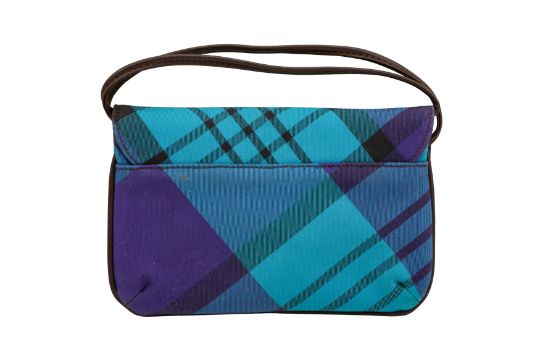 Vivienne Westwood Blue Tartan Orb Crossbody Bag, canvas fabric, purple check, brown leather trim and strap, ruthenium tone hardware