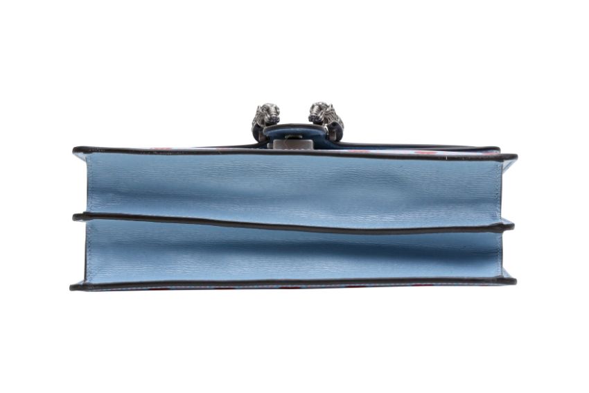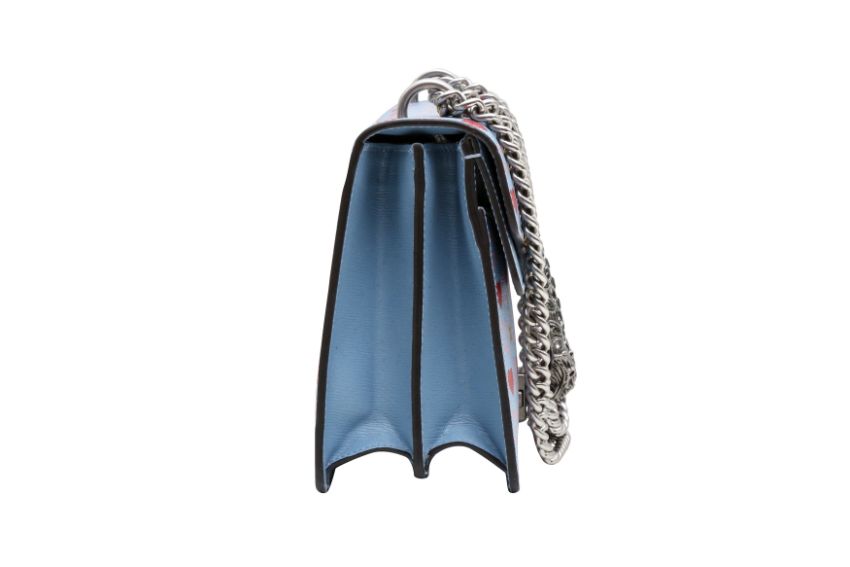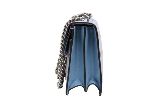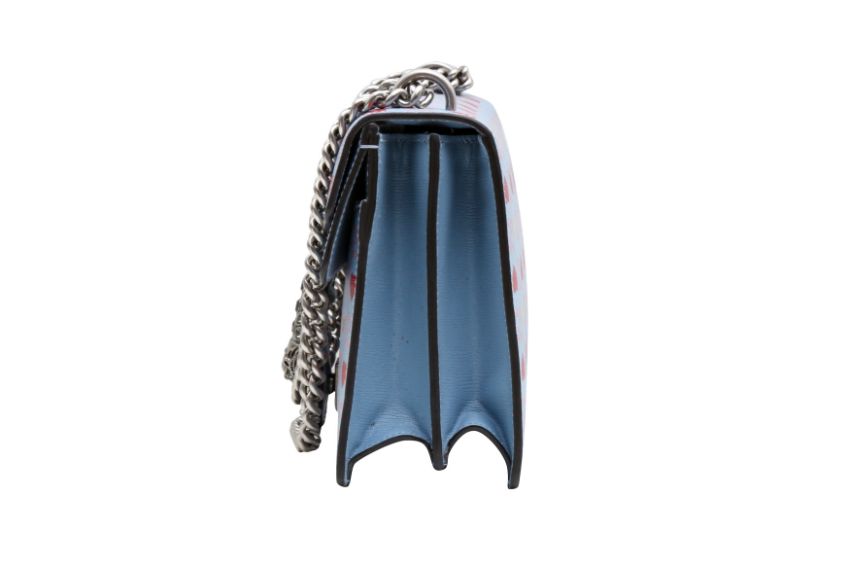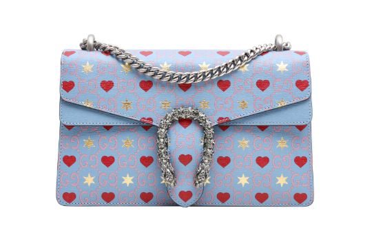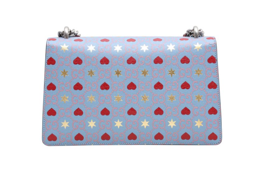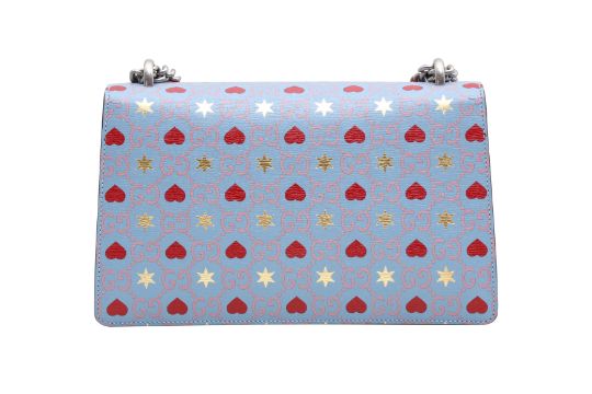 Gucci Blue GG Valentine Hearts Dionysus Bag, Limited Edition, calf leather, pink GG monogram, red heart and gold star motifs, crystal embellishment, ruthenium tone hardware