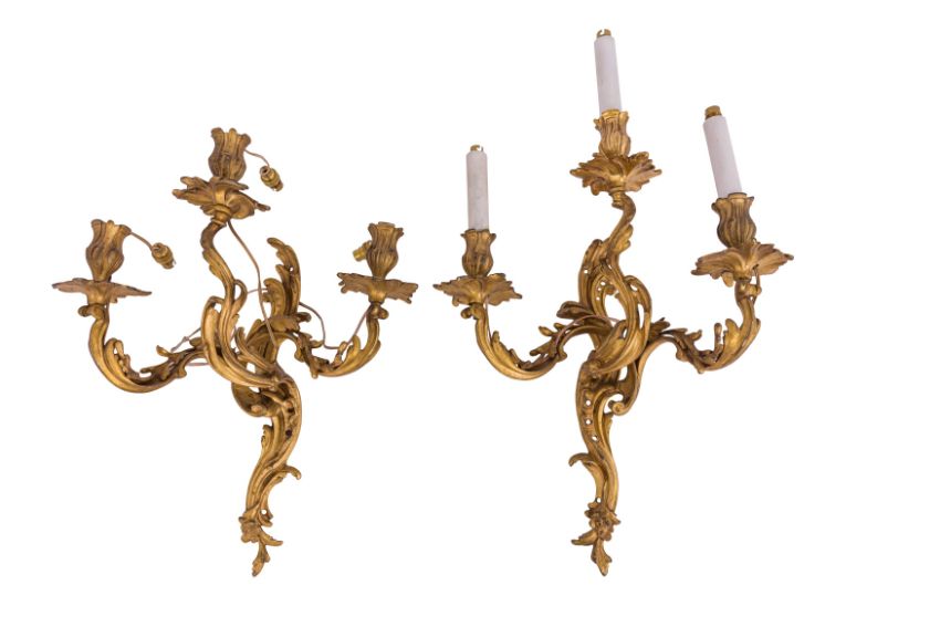 A PAIR OF ROCOCO STYLE THREE BRANCH WALL SCONCES, LATE 19TH/EARLY 20TH CENTURY, cast as scrolling intertwined acanthus leaves, one with 'candles'. (2)