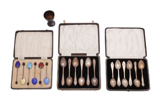 A cased set of George VI sterling silver and guilloche enamel coffee bean spoons, Birmingham 1939 by William Suckling Ltd