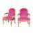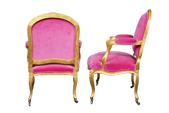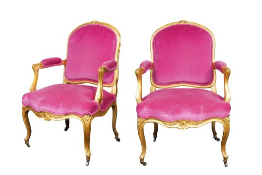 A PAIR OF LOUIS XV STYLE GILT FAUTEUIL ARMCHAIRS, LATE 19TH CENTURY, upholstered in pink fabric to the back, seat and arms, the frame carved with floral details. (2)