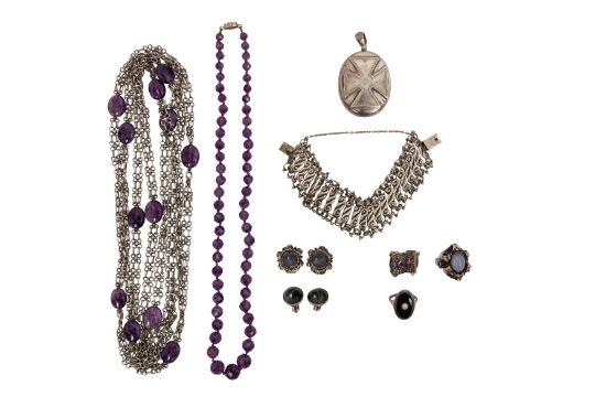 A GROUP OF SILVER JEWELLERY, To include an amethyst fancy-link longchain necklace, a amethyst graduated beaded necklace, a fancy-link openwork bracelet, an oval-shaped locket pendant with a Maltese cross on the front and a monogram on the back, a chalcedony suite of ring and clip earrings, a black onyx and pearl ring, a pair of amethyst and marcasite clip earrings of rectangular design, a pair of circular design cat's-eye obsidian clip earrings; some items stamped 925, total gross weight 237.8 grams (9)