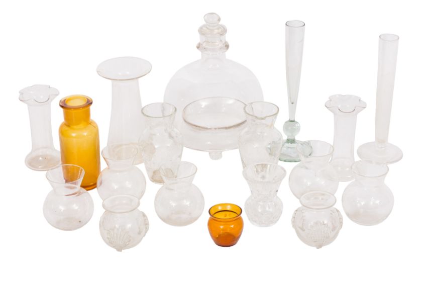 A GROUP OF 19TH AND 20TH CENTURY GLASSES, featuring 19th-century carriage glasses, various small vases, and flasks in both clear and amber glass, the vases range from bulbous forms with flared rims to taller, slender pieces, with molded details like ribbed patterns and floral motifs, highlighting the collection is a 19th-century fly trap, with a domed body resting on three small feet, and a funnel-like neck. (qty)