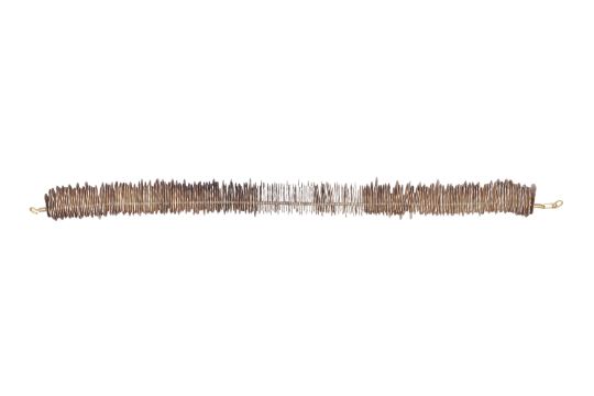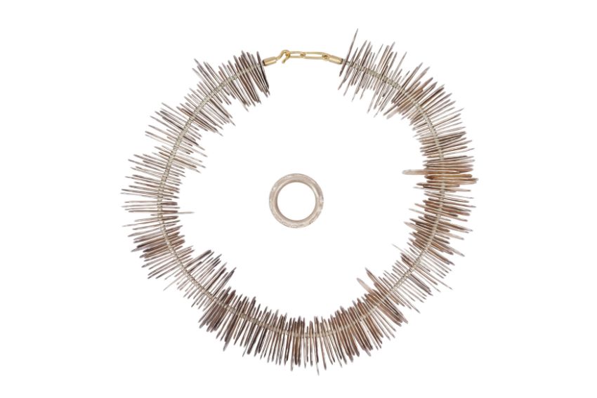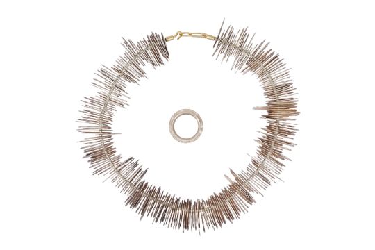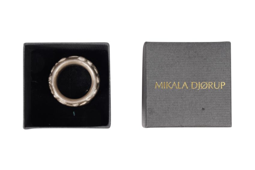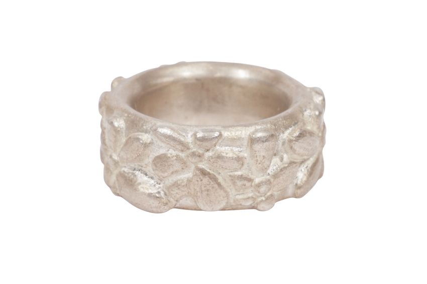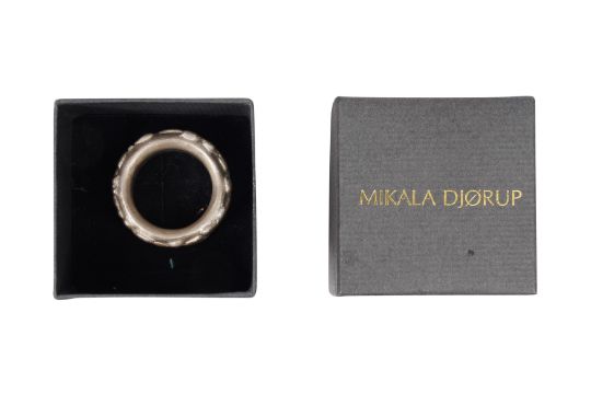 A SILVER RING AND A NECKLACE, The silver 10.3mm wide band, with floreal motifs, maker's mark, UK hallmark, size M½; together with a necklace composed of multiple discs aligned together, to a hook clasp, to a hook clasp, length 41.0cm; total gross weight 271.8 grams, together with a Mikala Djorup box (2)