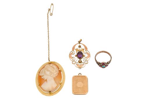 A GROUP OF JEWELLERY, To include a rectangular-shaped locket pendant with engine-turned decoration on both sides, stamped 15C, length 2.5cm; an oval-shaped shell cameo brooch, claw set with a yellow metal textured surround, pin and cable safety chain, maker's mark, unstamped, length 4.6cm; an open-work amethyst pendant of leaves design, to a dangling circular-cut amethyst at its end, unstamped, open loop, length 4.0cm; a garnet, seed pearl, and tuquoise ring, decorated throughout with naturalistic motifs, unstamped, size M; total gross weight 21.7 grams (4)