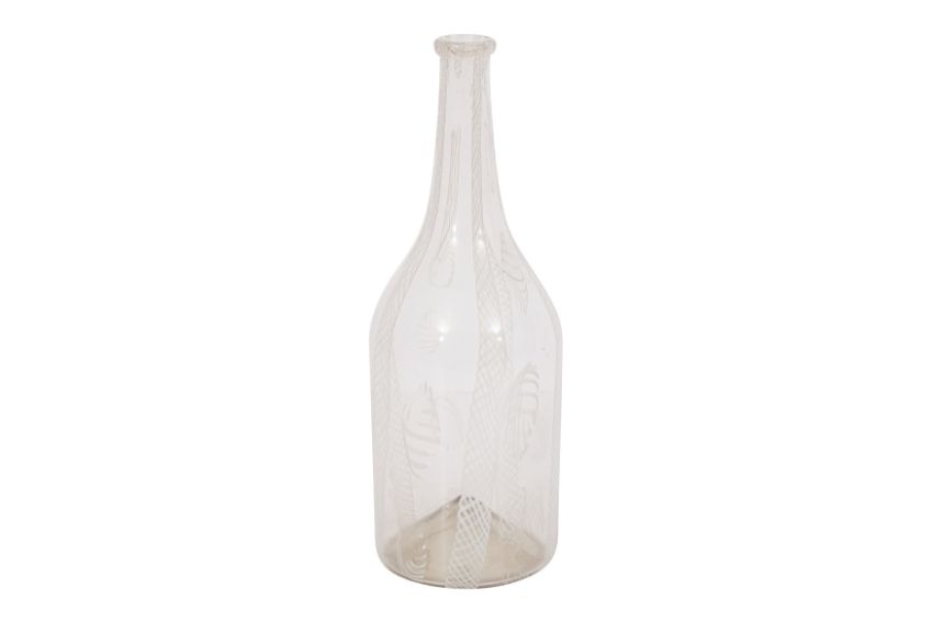 AN 18TH CENTURY SPANISH FAÇON de VENISE LATTICINO GLASS SERVING CARAFE,of slender bottle shape with a tall slim cylindrical neck and everted rim, featuring intricate white latticino canes swirled throughout the clear glass body.