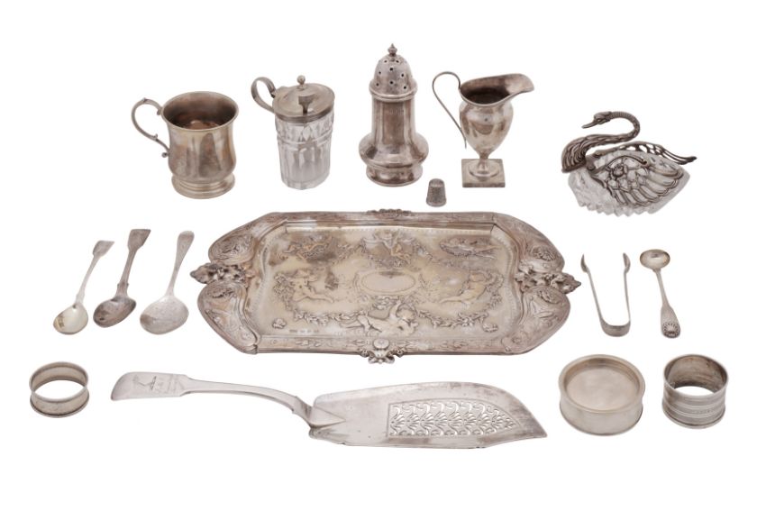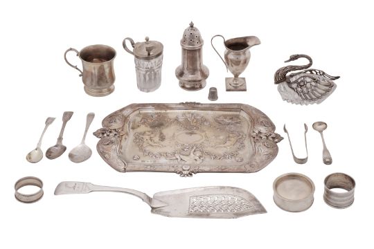Comprising a Victorian dressing table tray, Birmingham 1896 by Elkington and Co, a George IV fish slice, London 1825 by William Knight, Fiddle pattern latter engraved. Together with a swan bowl, cream jugs, mustard pot, sugar caster, a box, christening mug, napkin rings etc. (Q)