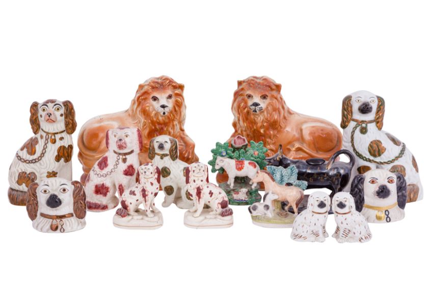 A GROUP OF STAFFORDSHIRE POTTERY ANIMALS, 19TH CENTURY AND LATER, including a pair of Victorian recumbent lions; ten spaniel figures, two being money boxes; a cow creamer; a bocage vase with a lamb, and a figure with a mare and foal. (15)