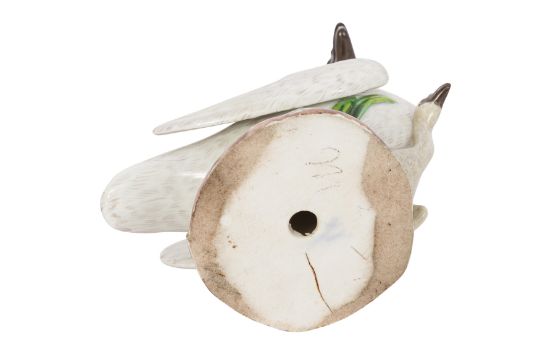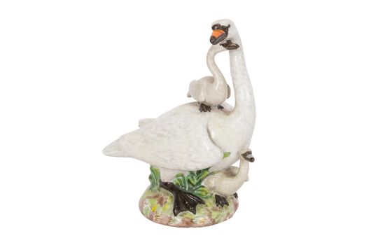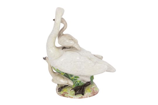 A LATE 19TH CENTURY MEISSEN SWAN GROUP, the swan standing, its head entwined around a small cygnet standing upon its back, another below, upon mound naturalistic base.