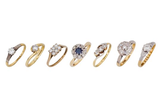 SEVEN DIAMOND RINGS, To include an 18ct yellow gold round brilliant-cut single-stone diamond ring, maker's mark, UK hallmark, size J; an 18ct yellow and white gold round brilliant-cut single-stone diamond ring in an illusion setting with decorated shoulders, maker's mark, UK hallmark, size K½; an 18ct yellow and white gold sapphire and single-cut diamond cluster ring, maker's mark, UK hallmark, size M; a two-tone metal single-stone round brilliant-cut diamond ring, stamped 18Ct & Plat, size J; a two-tone metal single-cut diamond cluster ring, stamped 18Ct, size J½; a two-tone metal single-cut diamond three-stone cross-over ring, stamped 18Ct Fine Plat, size L; a 9ct yellow gold round brilliant-cut diamond six-stone ring, maker's mark, UK hallmark, size J; total gross weight 16.3 grams (7)