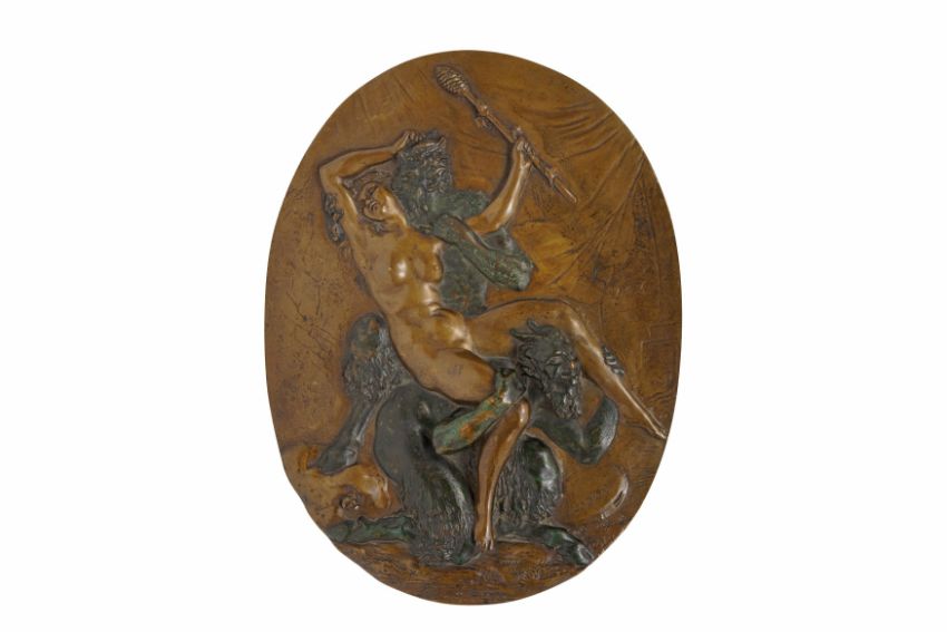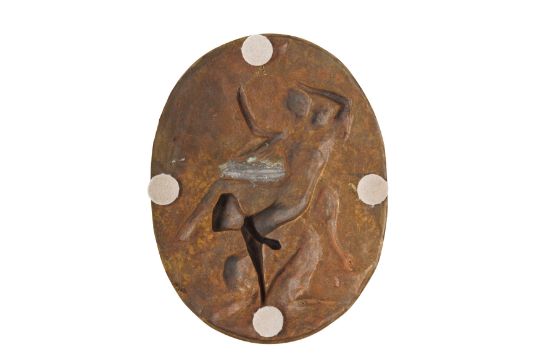 A 19TH CENTURY BRONZE RELIEF AFTER CLAUDE MICHEL CLODION (1738-1814), presenting a dynamic and mythological scene, the central figure, a nude female, depicted reclining gracefully while holding a thyrsus—a staff associated with Bacchus, below her, two satyrs support her in an energetic, flowing composition, the plaque signed "Clodion" on the lower section.