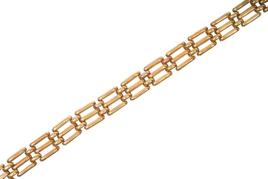 A FANCY-LINK BRACELET, Composed of articulated polished links of open-work design, to a box clasp with safety catch, undistinct stamp, length 20.1cm, weight 18.9 grams