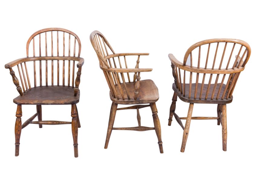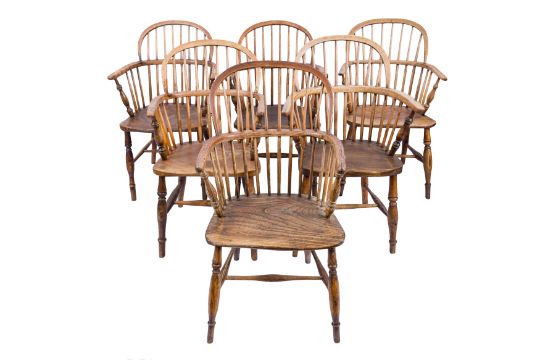 A HARLEQUIN SET OF SIX HOOP BACK WINDSOR CHAIRS, LATE 19TH TO EARLY 20TH CENTURY, most with ash hoop back, turned arm supports, elm saddle seats, and on turned legs joined by H stretchers. (6)