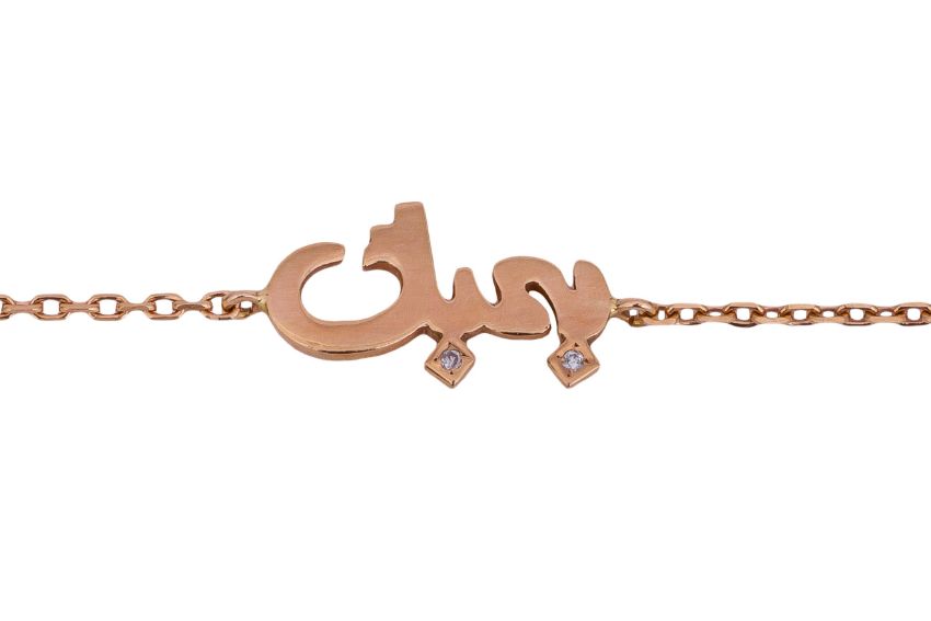A DIAMOND NAME BRACELET, With arabic inscription, set with two round brilliant-cut diamonds, to a cable-chain, stamped 18K, length 17.5cm, weight 1.3 grams